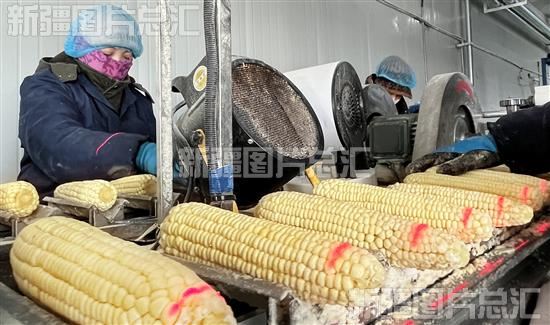 2023年3月8日,工人在位于福海县喀拉玛盖镇的九州农业发展有限公司鲜食玉米生产车间挑选玉米。