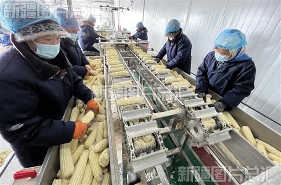 2023年3月8日,工人在位于福海县喀拉玛盖镇的九州农业发展有限公司鲜食玉米生产车间挑选玉米。