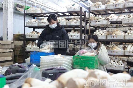 2023年3月6日,在新疆天山雪龙生物科技有限公司,工作人员正在将杏鲍菇包装外销。