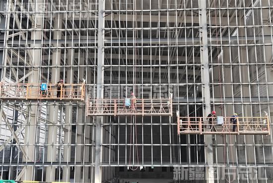 2023年3月2日,工作人员在新疆维吾尔药业有限责任公司年产1亿盒维吾尔药生产基地进行外立面钢架安装作业。