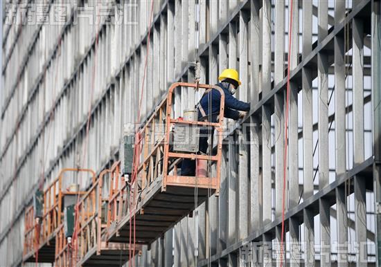 2023年3月2日,工作人员在新疆维吾尔药业有限责任公司年产1亿盒维吾尔药生产基地进行外立面钢架安装作业。