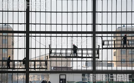 2023年3月2日,工作人员在新疆维吾尔药业有限责任公司年产1亿盒维吾尔药生产基地进行外立面钢架安装作业。