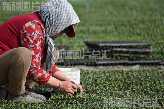 2023年3月8日,焉耆回族自治县包尔海乡开来提村三组农民在已长出的椒种苗进行补苗管理。