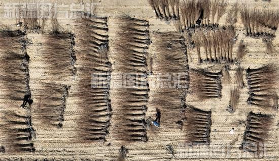 2023年3月10日,焉耆回族自治县七个星镇老城村一组农民在采挖杏树苗并打包(无人机拍摄)。