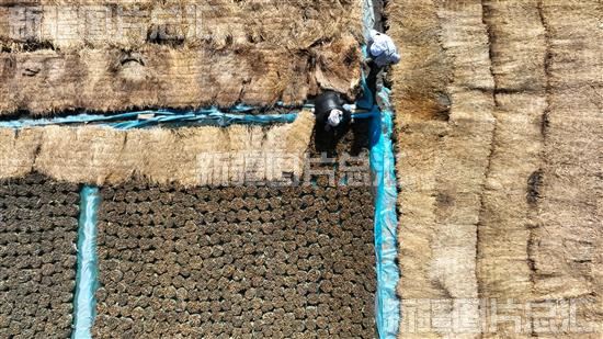 2023年3月10日,焉耆回族自治县七个星镇七个星村二组农民在对树苗进行泼水遮阳作业(无人机拍摄)。