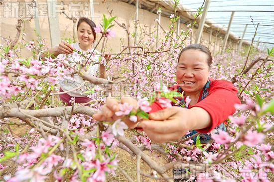 2023年3月10日,在库车市比西巴格乡其乃巴格村现代农业科技示范园内,村民忙着为蜜桃进行人工授粉。