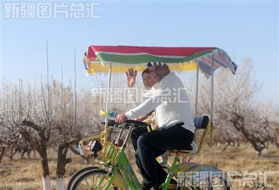 2023年3月16日,游客在托克逊县夏镇南湖村的万亩杏花园里骑行赏花。