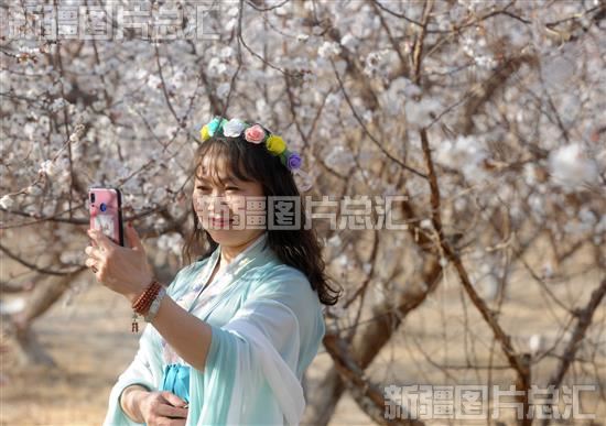 2023年3月16日,游客在托克逊县夏镇南湖村的万亩杏花园里自拍。