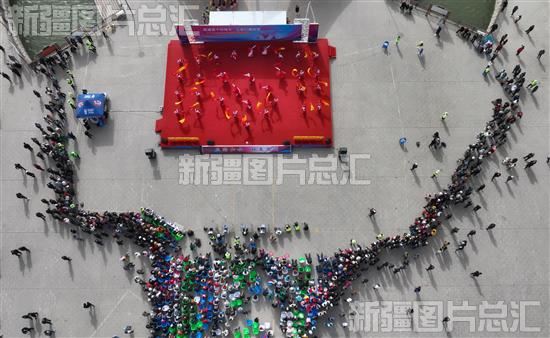2023年3月28日,参赛队员在库尔勒市鸿雁广场表演广场舞(无人机拍摄)。