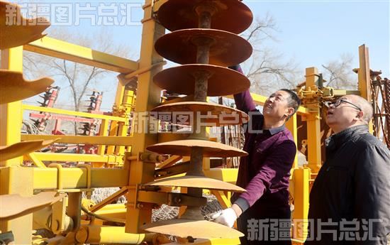2023年3月11日,新疆生产建设兵团第六师101团四连职工在检修农机具。