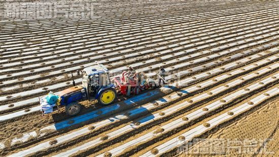 2023年3月29日,在博乐市小营盘镇铁日木布拉格村田地里,一台台中型农机具正紧张地“忙碌”着,随着一条条“银龙”的铺展,一幅生机勃勃的春播图跃然眼前,博尔塔拉蒙古自治州2000余亩土豆正式开播(无人机拍摄)。
