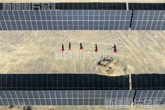 2023年3月25日,新疆油田公司电力公司工作人员在克拉玛依市乌尔禾区百口泉采油厂百21井区的光伏发电站巡检(无人机拍摄)。