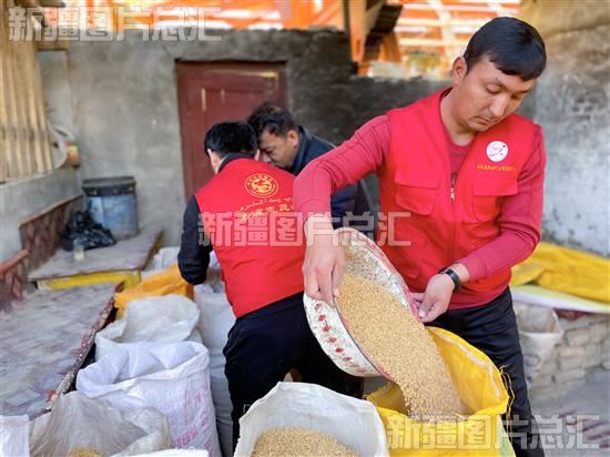 2023年3月2日,志愿者在洛浦县纳瓦乡巴什尕帕村帮助村民装袋小麦。