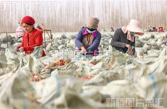 2023年2月28日,库车市墩阔坦镇繁荣村村民将辣椒入袋封口,准备装车外运。