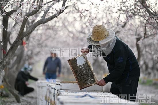 2023年3月30日,蜂农在轮台县阳霞镇库都克村一杏园管护蜜蜂。