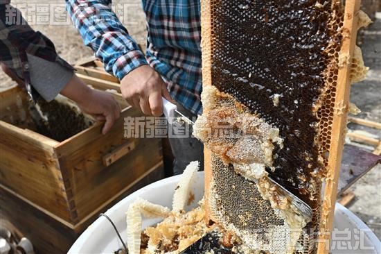 2023年3月30日,蜂农在轮台县阳霞镇库都克村一杏园收获蜂蜜。