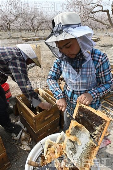 2023年3月30日,蜂农在轮台县阳霞镇库都克村一杏园收获蜂蜜。