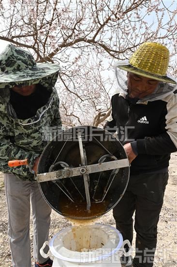 2023年3月30日,蜂农在轮台县阳霞镇库都克村一杏园收获蜂蜜。