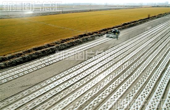 2023年3月14日,职工驾驶农机在新疆生产建设兵团第二师二十二团一处农田里进行铺膜作业。