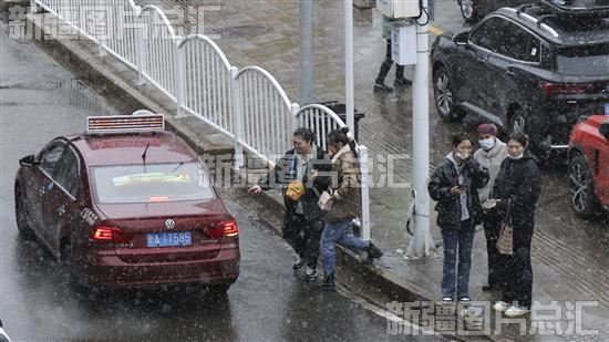 2023年3月19日,在乌鲁木齐市阿勒泰路,行人冒雪在路边打车。