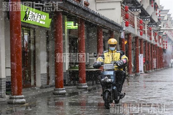 2023年3月19日,在乌鲁木齐市温州街,快递小哥冒雪前行。