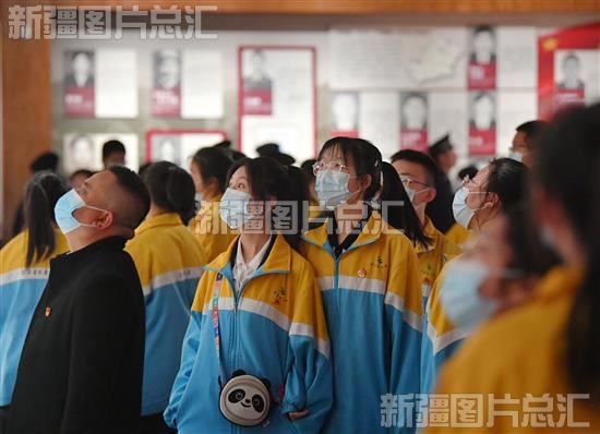 2023年4月2日,市民与学生在乌鲁木齐市烈士陵园烈士事迹陈列馆参观。