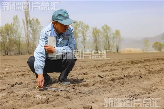 2023年4月7日,在新源县则克台镇阔克英村农田里,中粮屯河新源糖业有限公司技术人员在查看种植户甜菜播种情况。