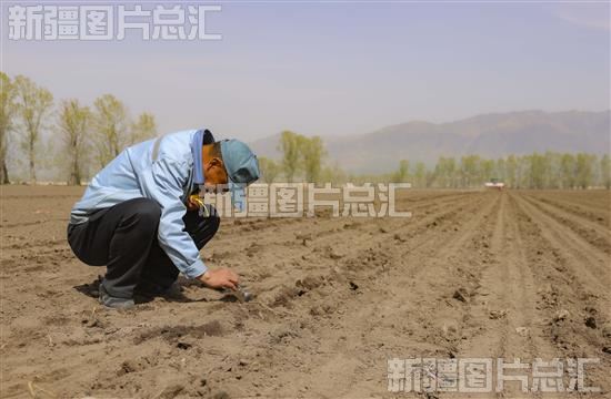 2023年4月7日,在新源县则克台镇阔克英村农田里,中粮屯河新源糖业有限公司技术人员在查看种植户甜菜播种情况。