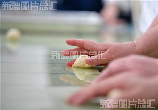 2023年2月23日,技能培训学校老师在社区食堂,给乌鲁木齐高新区(新市区)友谊路街道永昌社区居民示范西式面点揉面的手势。