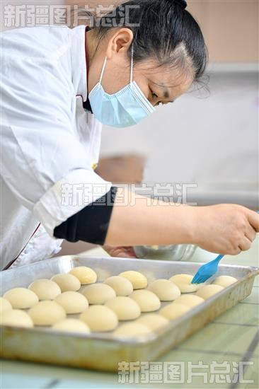 2023年2月23日,乌鲁木齐高新区(新市区)友谊路街道永昌社区居民在技能培训学校老师的指导下,为西式面点刷上蛋液。