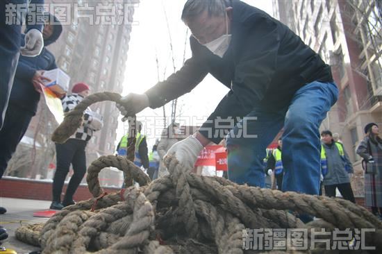 2023年2月19日,乌鲁木齐高新区(新市区)北京路街道呈祥社区居民展开麻绳,准备进行拔河友谊赛。