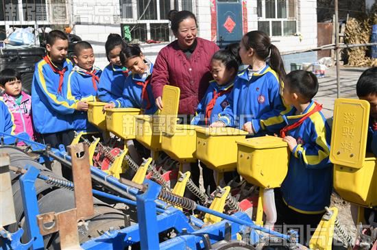 2023年4月7日,农户为学生们讲解播种机的工作原理。