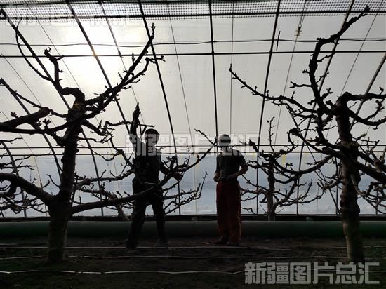 2023年2月14日,乌鲁木齐高新区(新市区)安宁渠镇塞外水乡生态农场的工作人员在樱桃大棚里进行修枝作业。