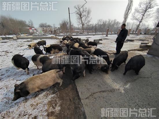 2023年2月14日,乌鲁木齐高新区(新市区)安宁渠镇塞外水乡生态农场的工作人员在投喂散养的巴马香猪。