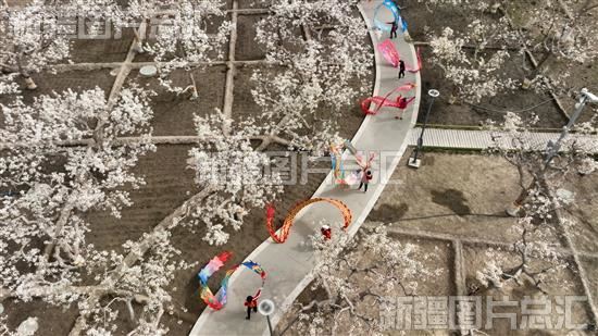 当日,春暖花开,库尔勒市彩带龙健身爱好者来到孔雀河畔的香梨园,进行彩带舞表演活动,享受春日健身乐趣。