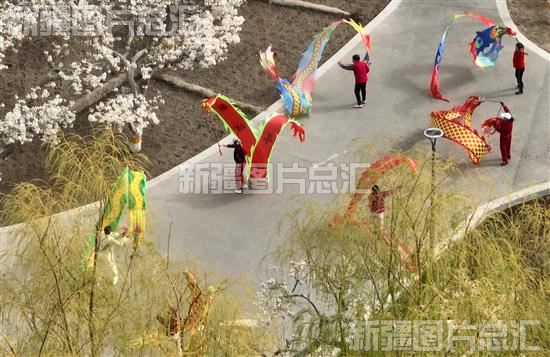 当日,春暖花开,库尔勒市彩带龙健身爱好者来到孔雀河畔的香梨园,进行彩带舞表演活动,享受春日健身乐趣。