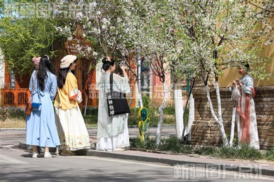 2023年4月6日,游客在伊宁市六星街拍照留念。近日,随着伊犁河谷各种鲜花的盛开,吸引了众多“追花人”纷纷前来打卡。张庆华摄