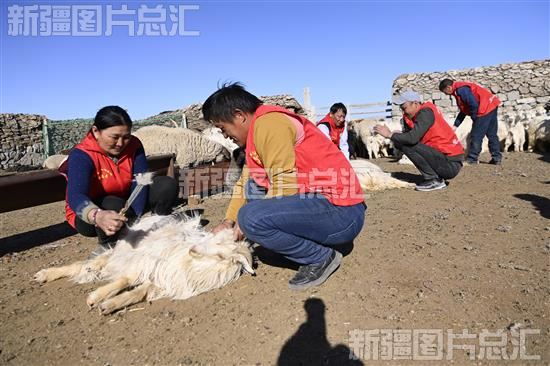 2023年4月6日,和布克赛尔蒙古自治县自然资源局驻布斯屯格牧场布呼特村“访惠聚”工作队队员帮牧民抓羊绒。