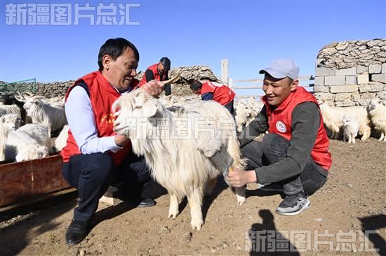 2023年4月6日,和布克赛尔蒙古自治县自然资源局驻布斯屯格牧场布呼特村“访惠聚”工作队队员帮牧民抓羊绒。