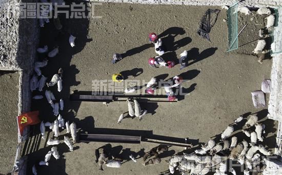 2023年4月6日,和布克赛尔蒙古自治县自然资源局驻布斯屯格牧场布呼特村“访惠聚”工作队队员帮牧民抓羊绒(无人机拍摄)。