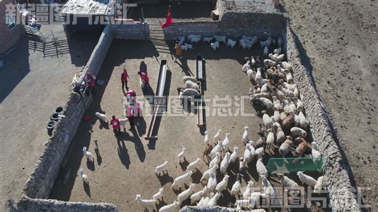 2023年4月6日,和布克赛尔蒙古自治县自然资源局驻布斯屯格牧场布呼特村“访惠聚”工作队队员帮牧民抓羊绒(无人机拍摄)。