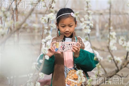 2023年4月9日,小游客在博湖县查干诺尔乡百亩杏园拍照。