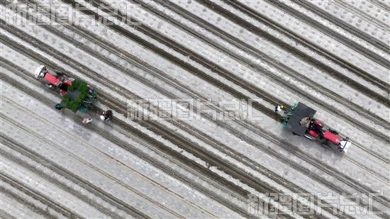 2023年4月11日,焉耆回族自治县五号渠乡四号渠村农民驾驶吊环式秧苗移栽一体机移栽辣椒苗(无人机拍摄)。