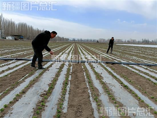 2023年4月11日,沙湾市乌兰乌苏镇头浮新村种植户在豌豆地里放苗。