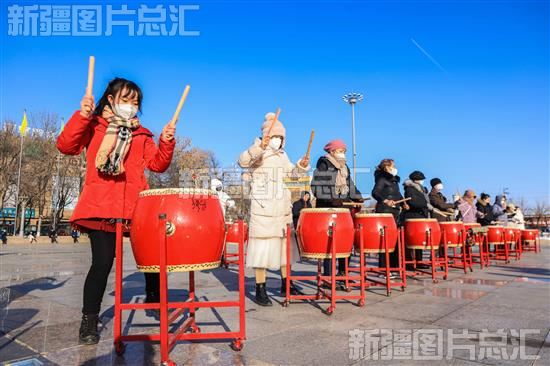 2023年1月29日,演员在新源县人民广场排练威风锣鼓。