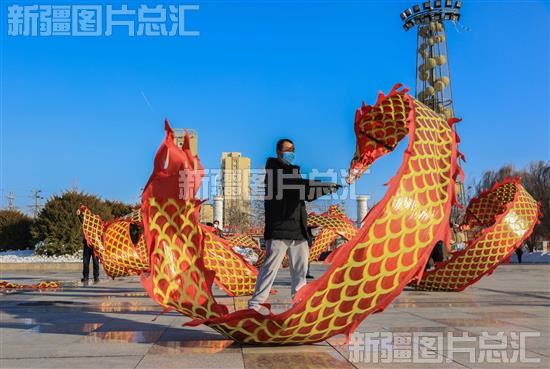 2023年1月29日,演员在新源县人民广场排练舞龙。