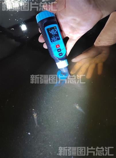 2023年4月11日,工作人员在裸腹鲟繁育基地温室池塘检测水质。