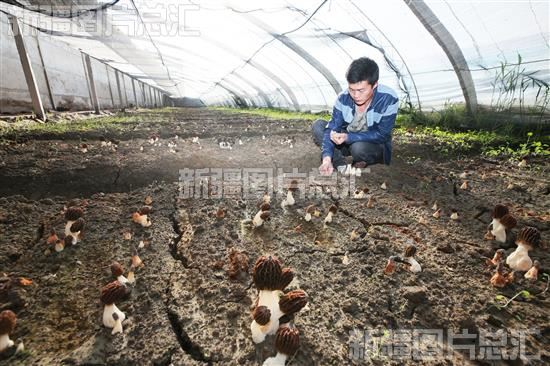2023年3月31日,种植户在新疆生产建设兵团第三师41团草湖镇的蔬菜大棚里管护羊肚菌。