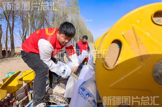 2023年4月12日,党员志愿者在博湖县博斯腾湖乡库代力克村棉田里为棉花联合播种机更换地膜。