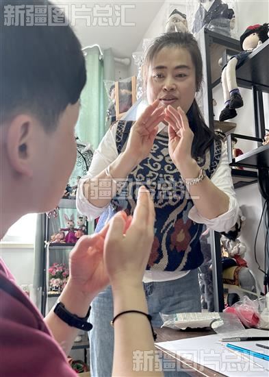 2023年4月12日,位于乌鲁木齐市沙依巴克区的新疆残疾人文化创业产业基地(就业创业孵化基地)教师和学员交流布偶制作技艺。